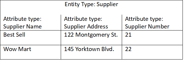 Next building block is attribute “types”, which represents a set of properties for entity “types”. For supplier, we can have supplier name, supplier address, and supplier number for example. Supplier number can be unique, which means it doesn’t “repeat”, but name for example may overlap.
