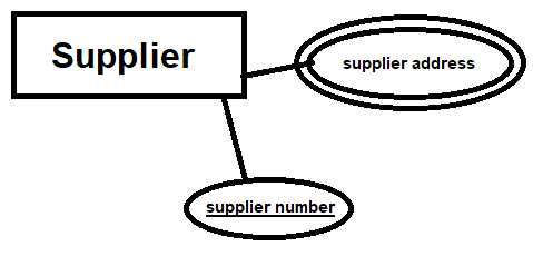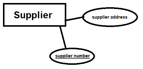 Supplier number above is underlined to represent its key attribute type. This is a unique attribute type with values that are distinct for individual entity. A great example of key attribute type is a serial number, as there will never be same serial numbers for same product number. Another great example is social security number. Key attribute type can also be a combination of multiple attribute types.