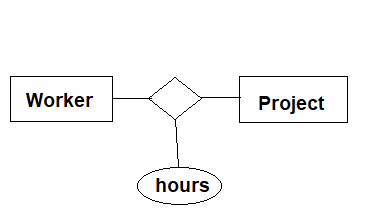Relationship can also have attribute as shown below. Ellipse is attached to the rhombus and not to worker or project because the attribute type represents how much the worker put in for a specific project and project hour is broken down by the worker, so it can’t be a sole property of either entity types and needs to be modeled as attribute type of the relationship type.