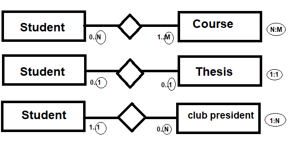 As shown above, a course entity type can have minimum of 0 student and maximum of N students. This is depicted on the “student” entity type side of the relationship relative to the rhombus. Respectively, student entity type can have minimum of 1 course and maximum of M courses. Thus resulting in N:M cardinality using the maximum cardinality for roles. Next, we have student to thesis where thesis doesn’t need a student assigned but if they do, maximum of 1 student can be assigned. While student doesn’t need to have thesis but if they do, they are allowed maximum of 1. Lastly we have student to club president where student doesn’t need to be the club president but if they decide to be one, they can do as much as they can handle. But club president role needs to be filled by minimum of 1 student and there can only be 1, so that’s the max, hence 1:N relationship.